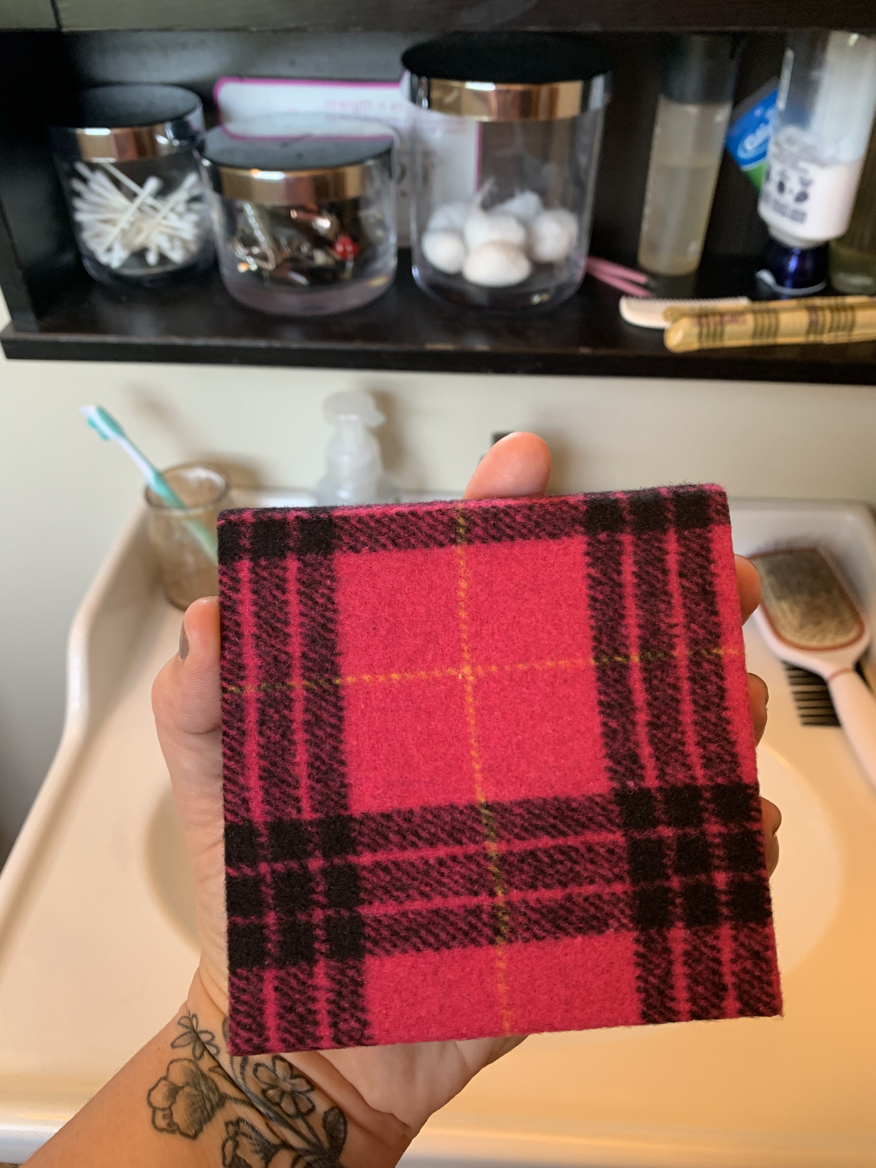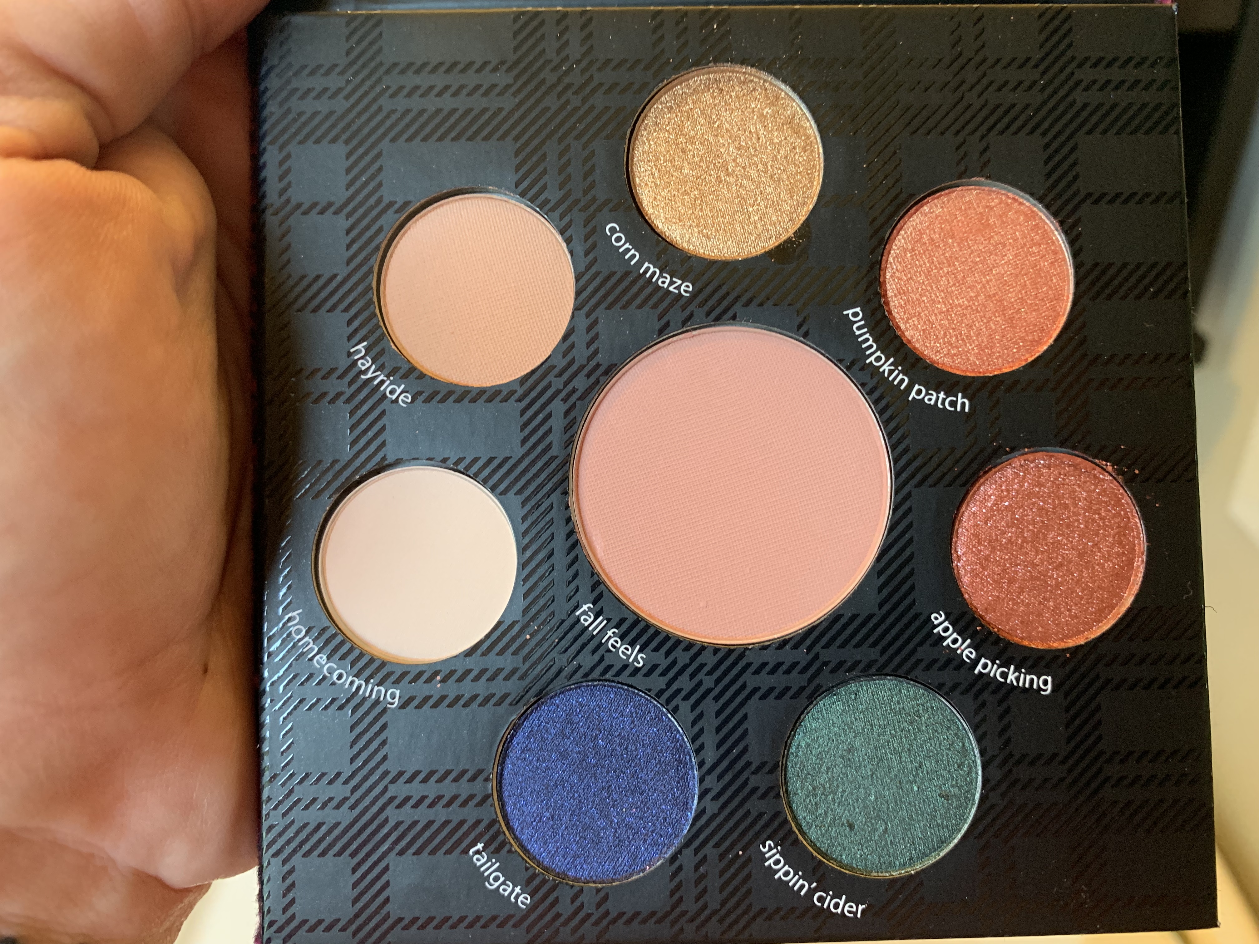 Fall Feels Eyeshadow and Cheek Palette This palette contains beautiful, highly pigmented colors in a mix of matte and metallic shades. Just the names make me happy… Corn Maze, Pumpkin Patch, Apple Picking, Sippin Cider, Tailgate, Homecoming, and Hay Ride. I was able to create a look for today that was warm and beautiful for a late summer day in the orchard. And again, the packaging is amazing. The palette is covered in a soft, furry red plaid.