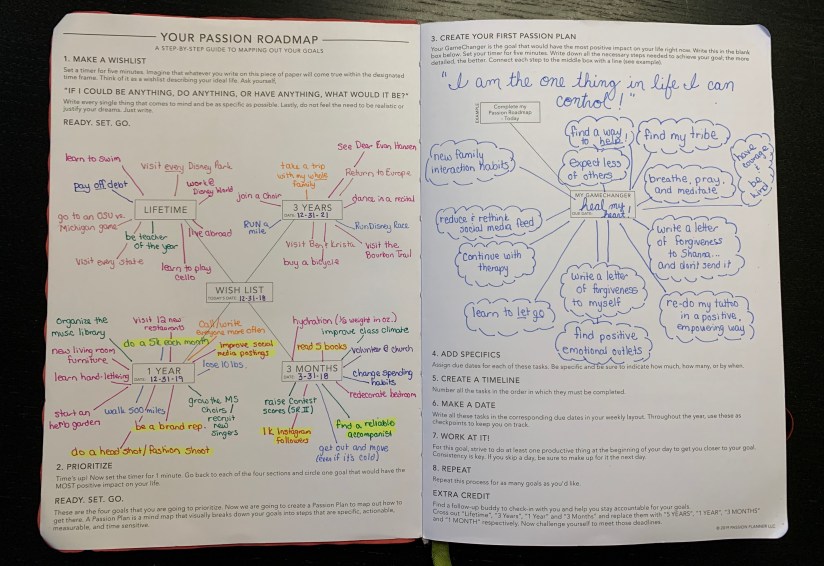 The book begins with a Passion Roadmap, helping you set up goals for the next three months, year, three years, and your lifetime. Then, there is a space to focus on one Big Picture goal. This really helps me focus on the year ahead. After the month of June, there is an identical space to check on how you are doing.