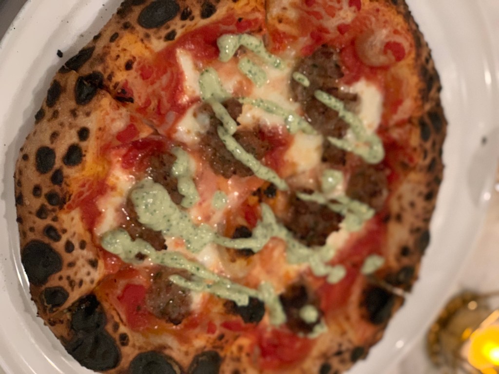 Jeff had the Palla pizza with a cup of Italian Wedding Soup. The soup had a broth with enough flavor that you could sip it with no other ingredients like Baby Yoda during a fistfight. The vegetables, sausage and salty cheese in the broth made for a hearty, lingering taste that made you want to finish every last drop. The pizza had the standard base of tomato sauce, mozzarella, and chewy crust. The crumbled meatballs had a nice, balanced spice and weren’t mealy or bready. The pesto drizzle provided a bright citrus contrast to the usual pizza flavor.