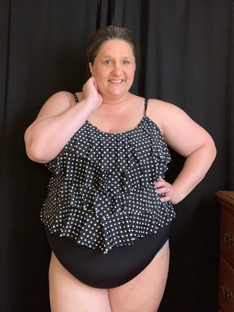 For the last two looks, I tried a solid black bottom and ordered a couple of different top pieces. The Leilani Women’s Plus Size High Waist Tummy Control Bikini Swim Bottom is incredibly high waisted and figure flattering. The fabric holds in your middle without feeling like it is cutting off your circulation. Honestly, I love these bottoms. They are secure, flattering, and have so much mix and match potential. The Kenneth Cole REACTION Women’s Plus Size High Neck Keyhole Halter Tankini (left) paired really nicely with the bottoms. I liked the fit of the high neckline, which made the suit feel secure overall. I just didn’t love the pattern in person. The Catalina Women’s Plus-Size Tiered Multi Ruffle Tankini was cute and I do love polka dots. Paired together, I just didn’t like how short it was compared to the high waist of the bottoms.