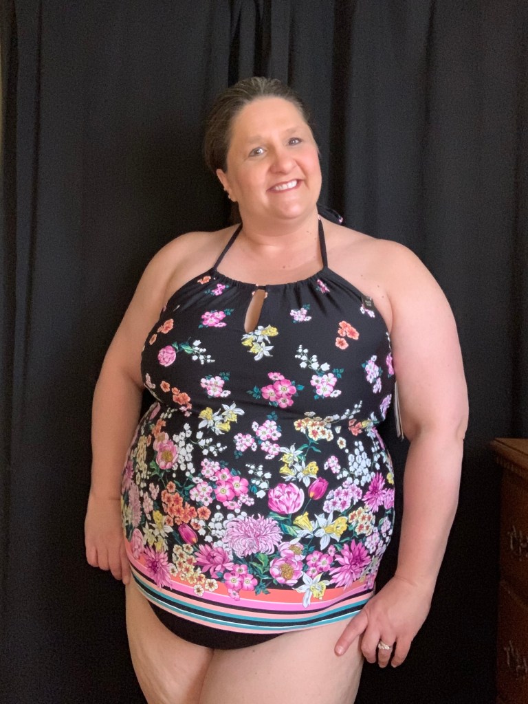 A couple of weeks ago, while boredom surfing online, I discovered the beauty of Amazon Prime Wardrobe. As an Amazon Prime member, this service is included in your annual dues. Basically the way it works is, you are allowed to fill a box with up to eight items in their selected collection of clothing and shoes to try on at home. You are allowed to keep the items for a week and have free shipping to send back whatever you decide not to keep. You only pay for what you decide to keep. It’s very similar to Stitch Fix and other related companies, but you can choose what you want to order with Amazon. Easy peasy. They did have a surprising amount of Plus Size styles available in Prime Wardrobe. I have never ordered clothes on Amazon before (I have ordered shoes and had good luck), so I thought I would try it out with new swimwear.