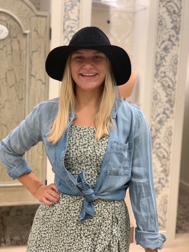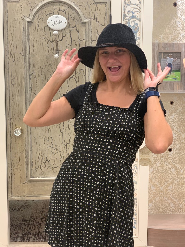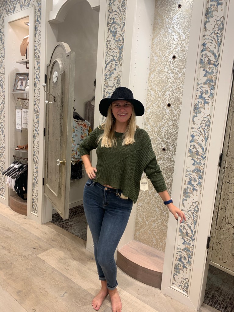 Amanda was a willing subject and was ready to experiment with whatever ideas I threw her way. That made the style session even more fun. I think the looks that suited her best were these outfits. They had a lot of 90’s retro vibes while adding a modern twist. Amanda looked absolutely beautiful in the sage green color that is featured in a lot of items in the store right now. (It really brings out her eyes.) She decided to take home the bottom two looks and the cute, casual grey dress that’s perfect for teaching. But the definite winner of the day was the black Charlotte Chenille Hat. I mean, seriously… how cute is that?!