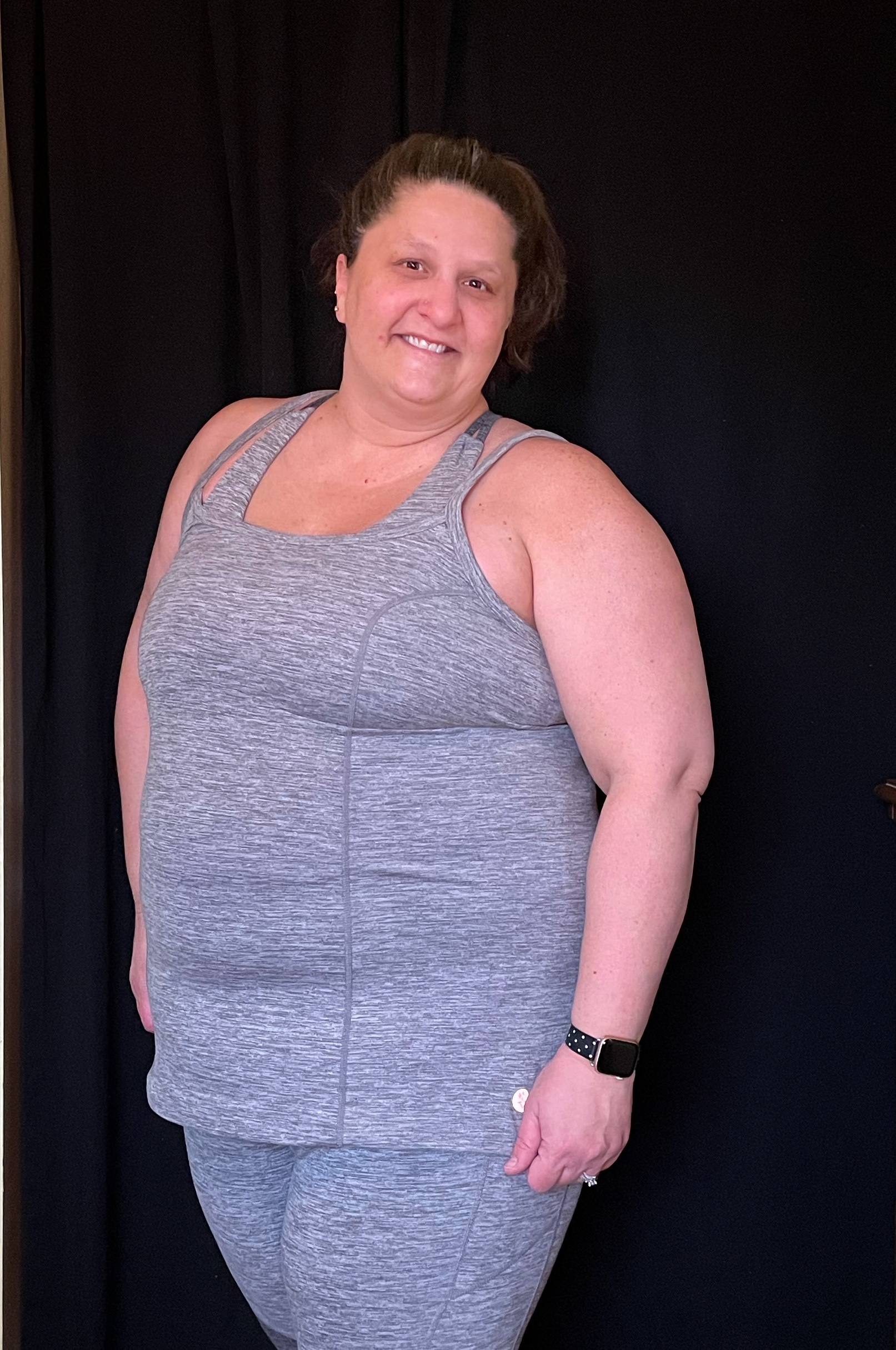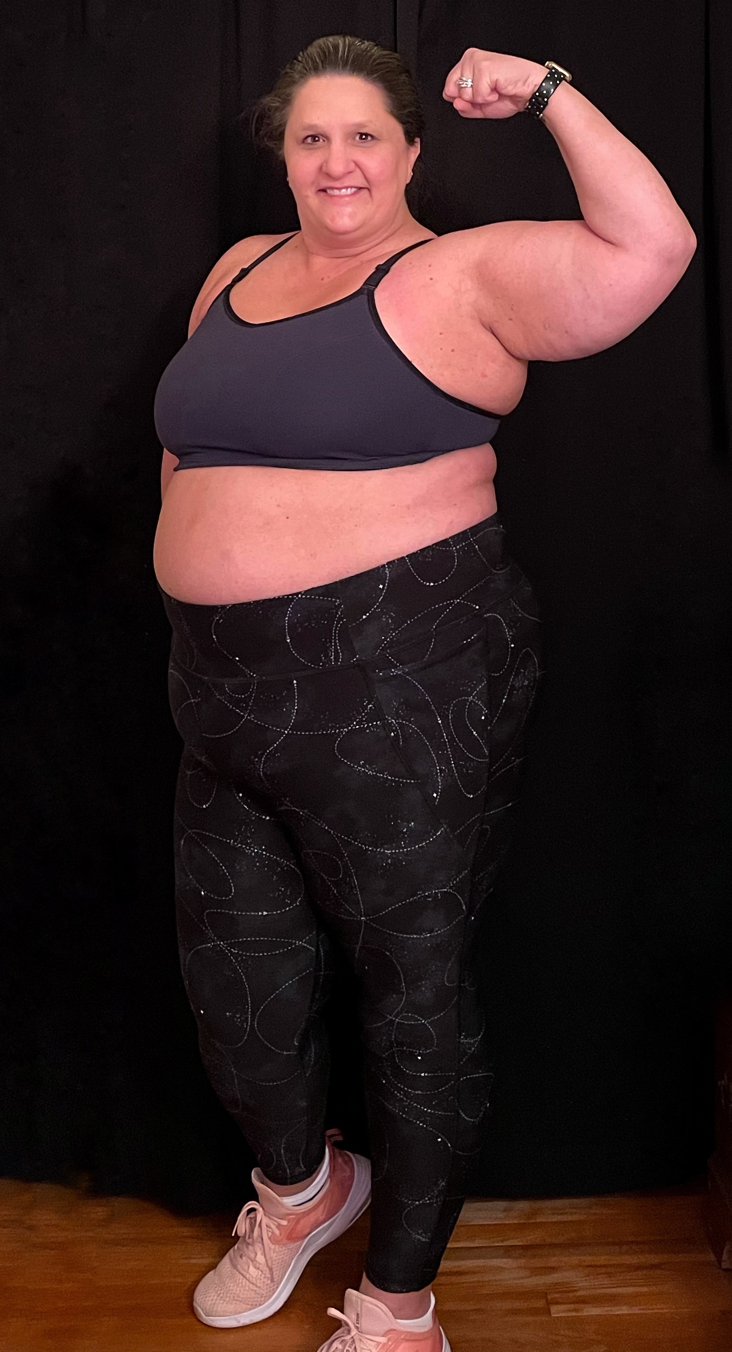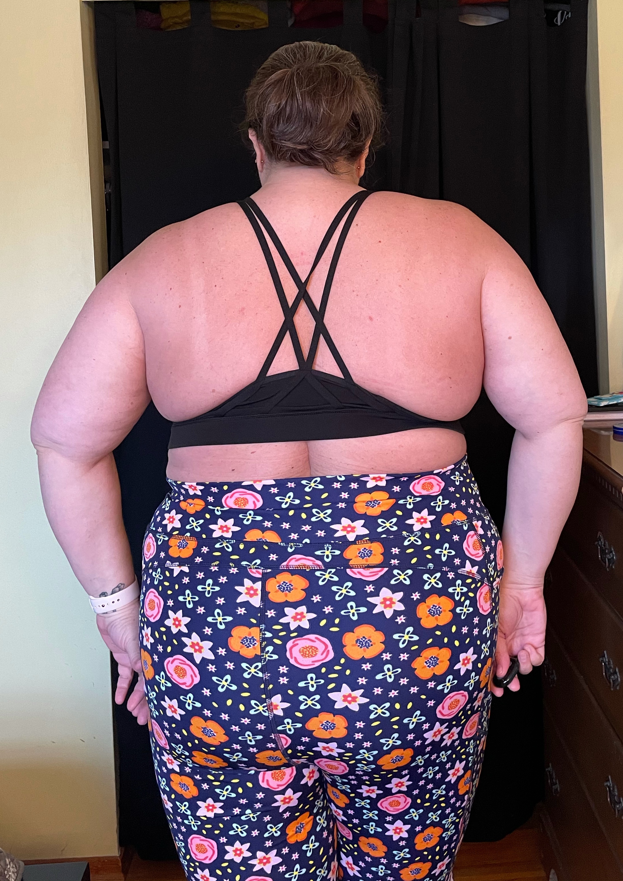 For reference: I am 43 years old. I stand at 5’8″ and weigh approximately 300 lbs. I am apple shaped, wearing my weight pretty evenly, but more through my middle. I usually wear a size 22/24 or a 3X and a 46 D bra. My shoe size is 11W, and I have very flat feet. I participate in a competitive 5K per month. My favorite types of exercise are vigorous walking, light jogging, and dance… plus I would like to pick up a yoga habit this year.
