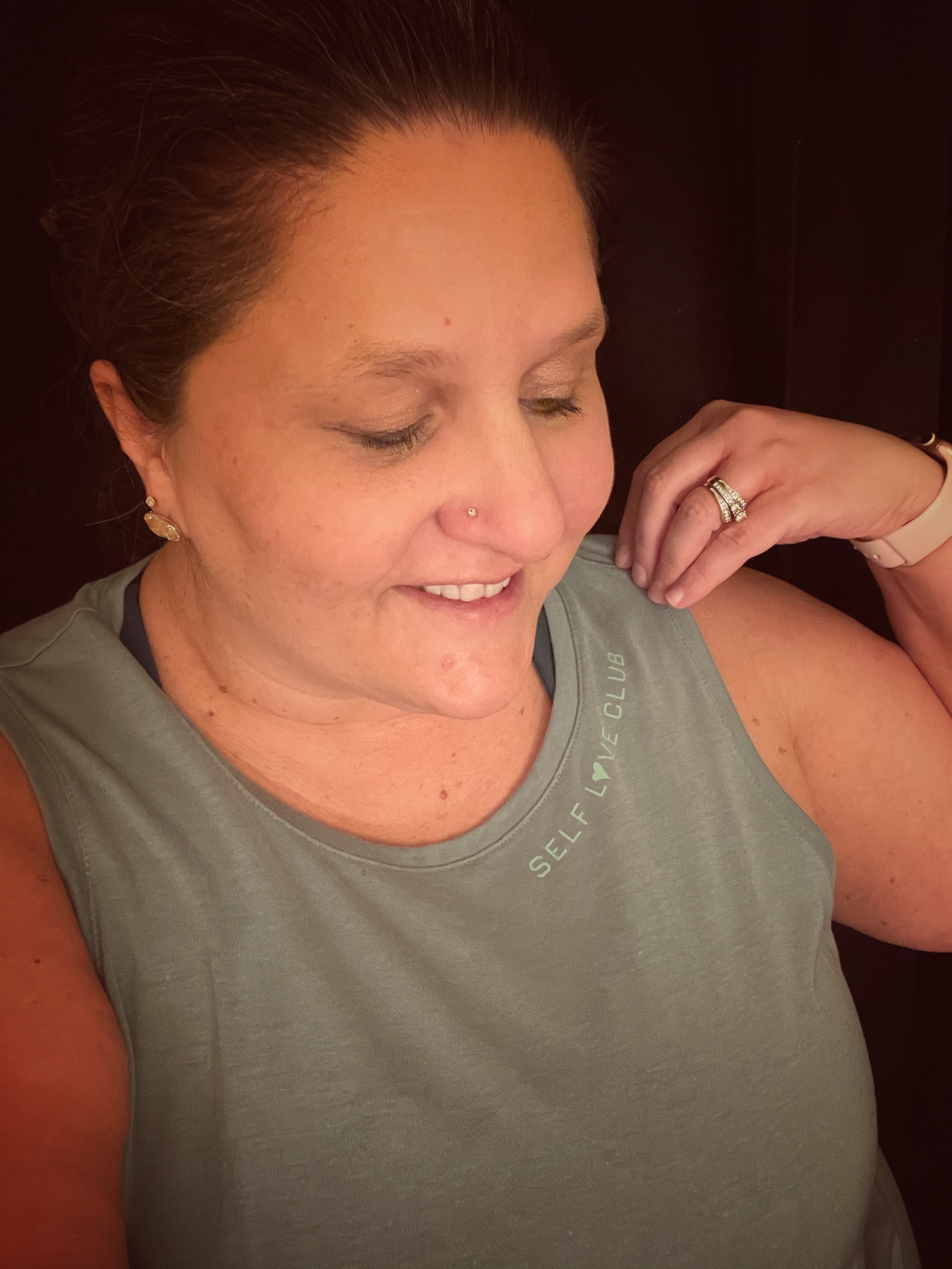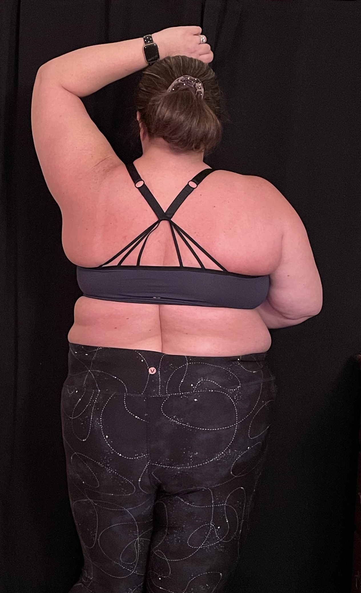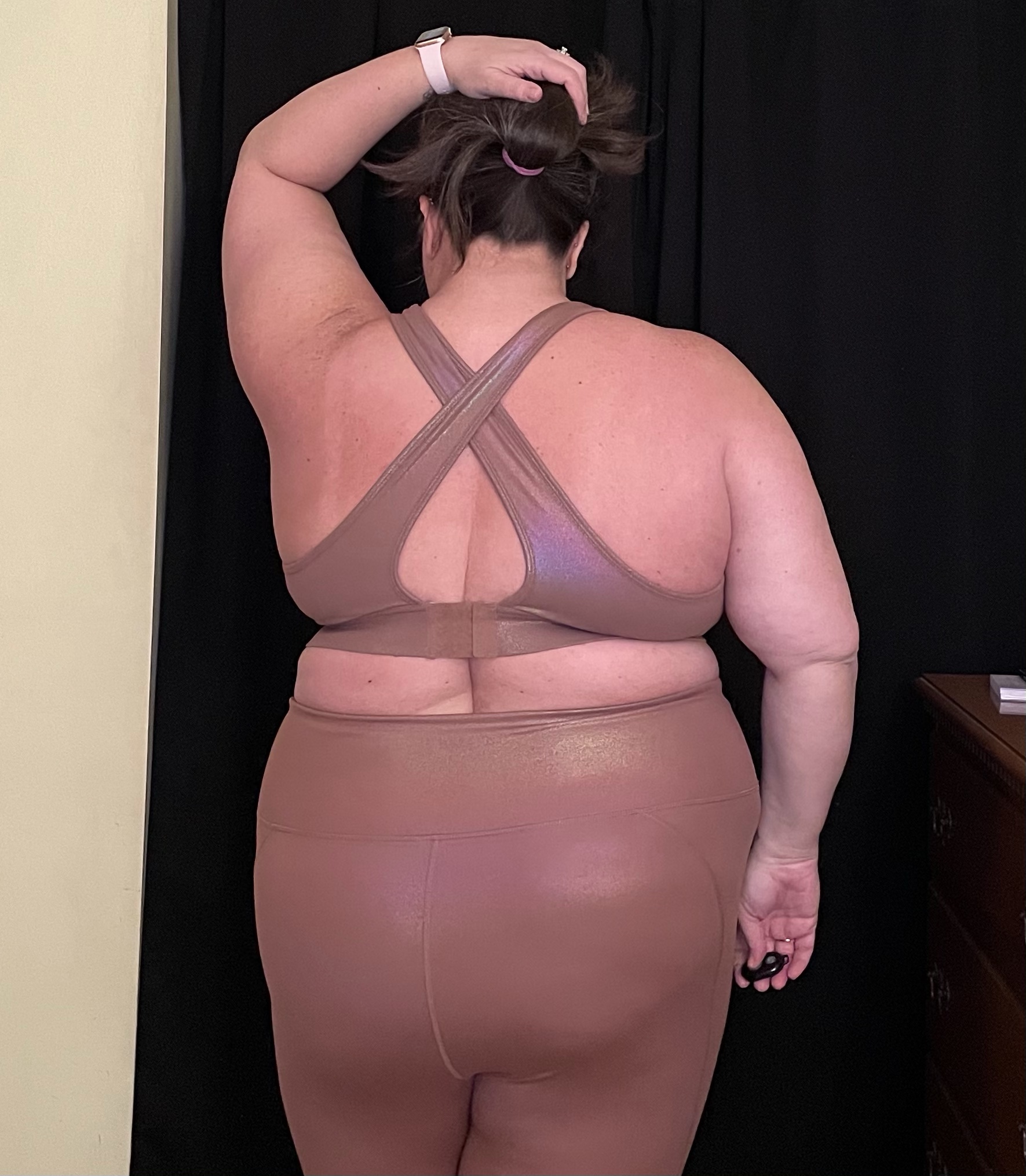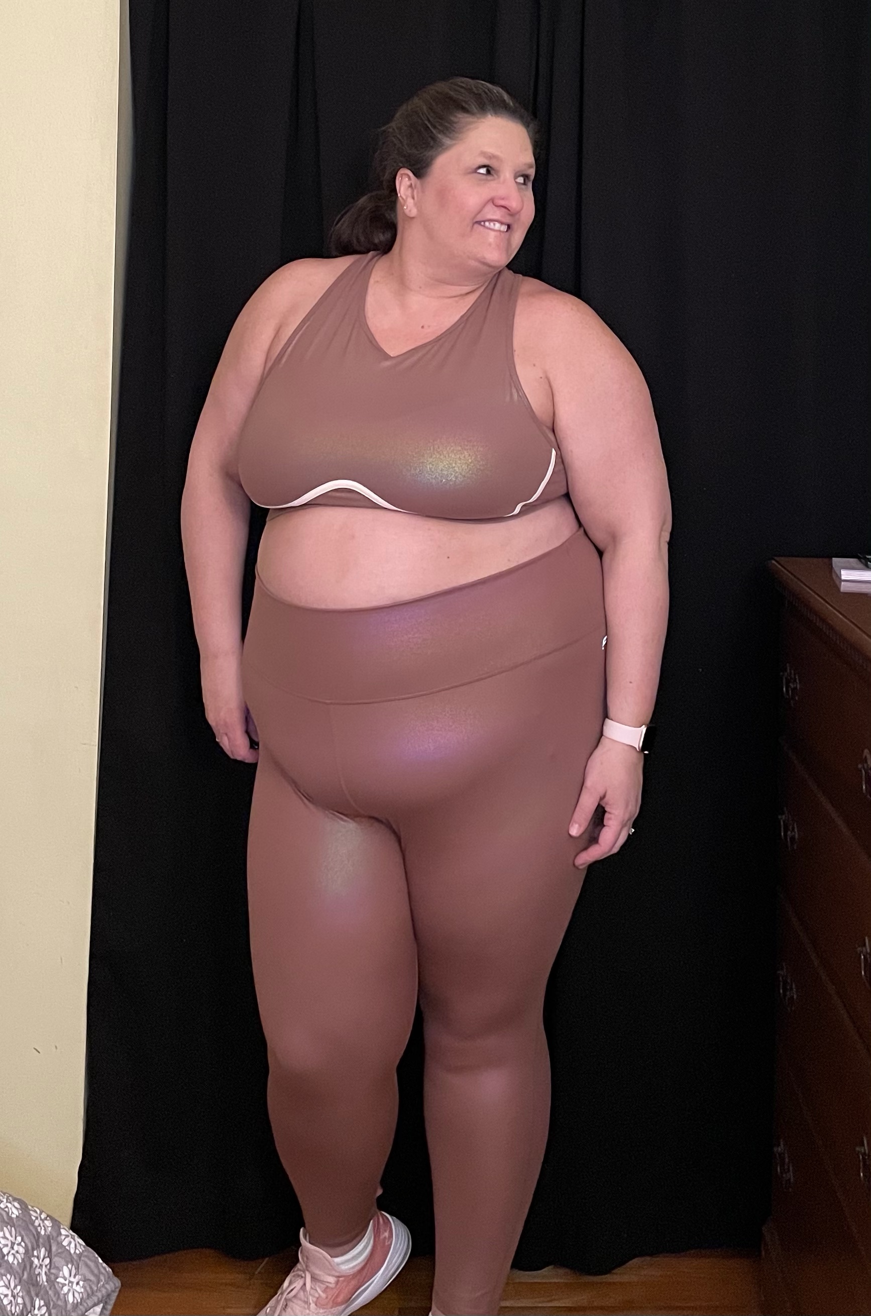- Leggings- I jumped on the High Waisted Luxe Leggings because of the beautiful shimmery fabric. This was a New Year look they offered for a limited time. The leggings are really beautiful in person. They are high waisted and supportive. My issue was the fabric was not super stretchy. Because of the way I wear my weight, the leggings had a tendency to roll when I sat down, and they caused a bit of chub rub.
