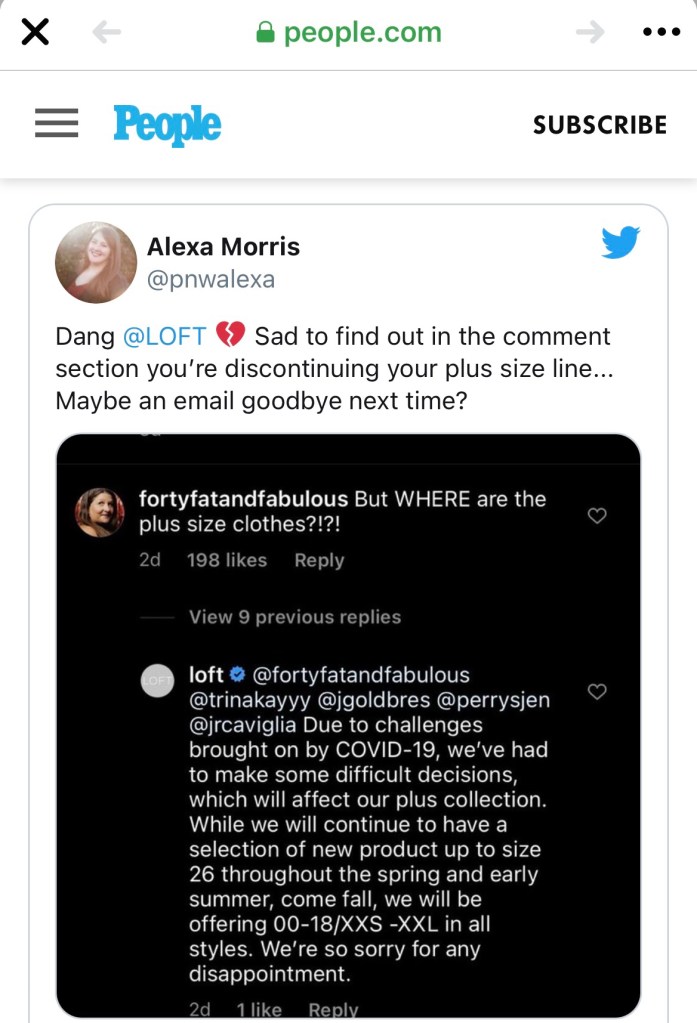 And most recently, I had the weird responsibility of blowing up the fat girl internet by being the one to find out that Loft was canceling their Plus Size line. It was quite strange and surreal to see my avatar showing up in People, on Yahoo, and referenced in posts from bloggers that I have respected for years. I mean, it’s not a happy thing, but I am glad that my voice was able to speak up on behalf of Plus Size customers and let a major national brand know that we will not be cancelled silently.