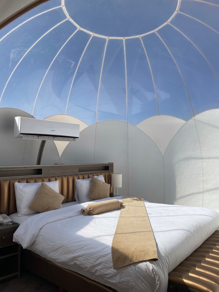 Perhaps the coolest part of the visit was staying in the Wadi Rum Bubble Luxotel. Our rooms for the night were housed in clear bubbles where we had grand views of the desert and the stars. It was other worldly. The stay included dinner, breakfast, and Bedouin tea with live music. Each room had a jacuzzi on the deck to lie in and gaze at the stars. And best of all, the dome over the bed felt like sleeping in a planetarium… but it was the ACTUAL sky! I will never forget it.