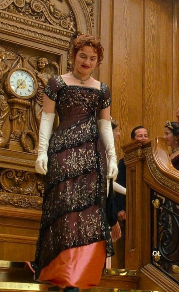 Kate Winslet in Titanic: I think the whole world had their breath taken away the moment Rose (Winslet) stepped onto the staircase. Her turn of the century, sheer black, silver beaded gown, with a blush layer underneath is so completely romantic. And the way Jack (Leonardo DiCaprio) gazes at her while she walks toward him is every girl’s dream.