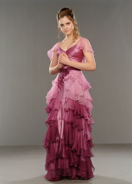 Emma Watson in Harry Potter and the Goblet of Fire: It’s no wonder that this is the moment Hermione’s (Watson) friends noticed that she was pretty. The ombre berry colors and layers of cascading chiffon with a blush satin bodice are so feminine and romantic.