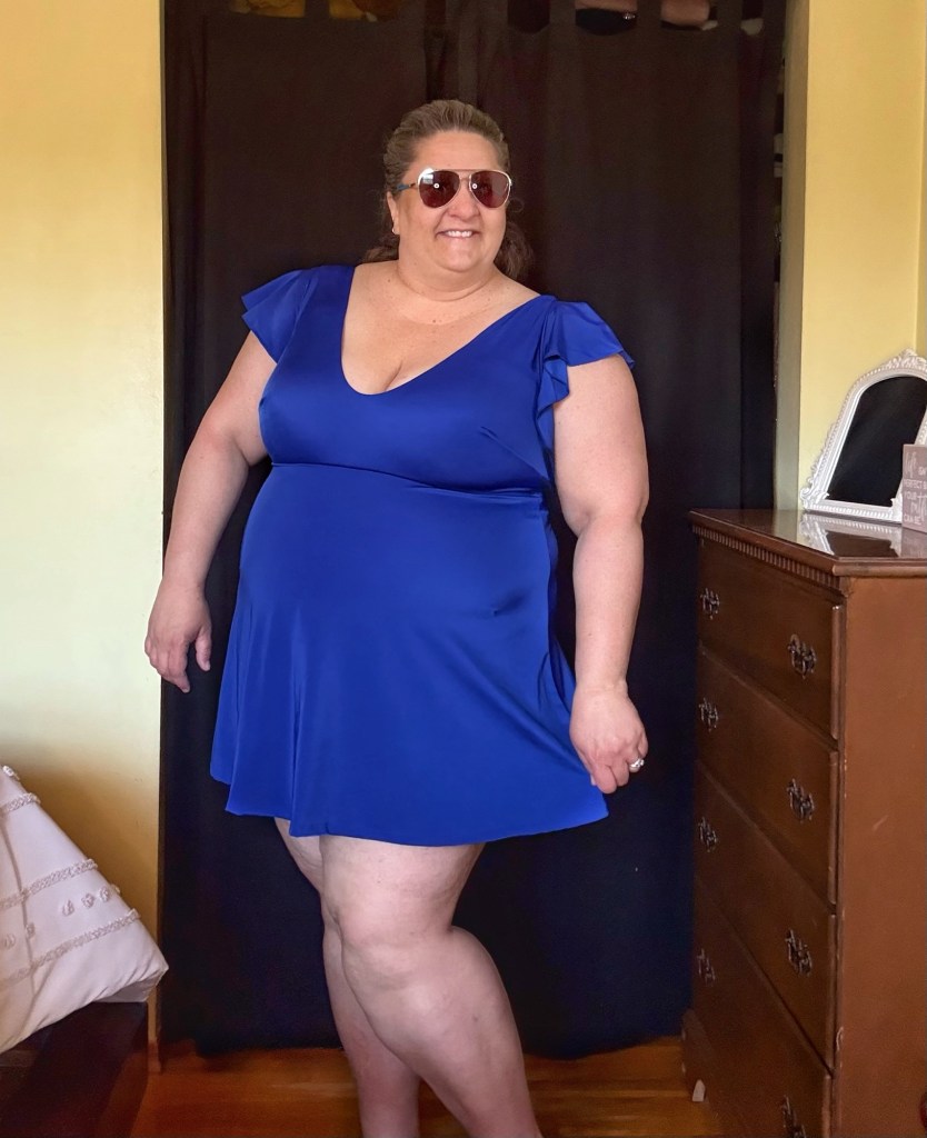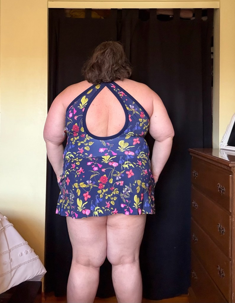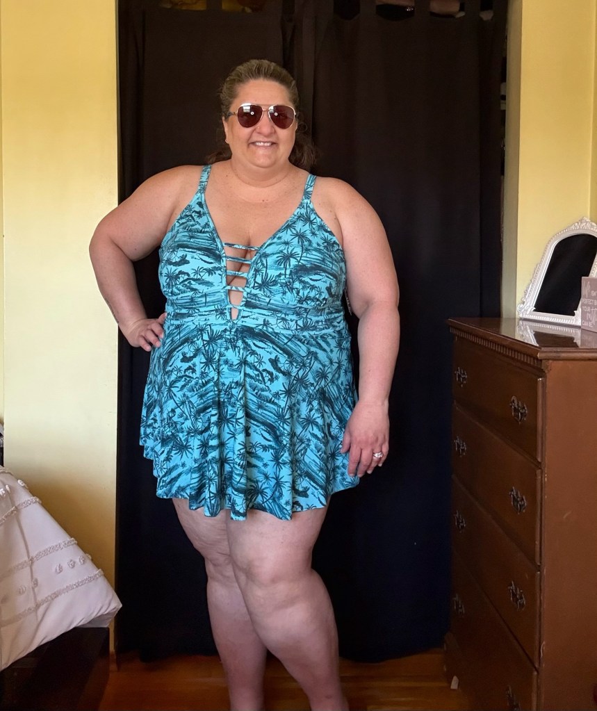 Not long ago I was that fat girl in a bikini, expressing my fat joy. It was glorious. However, my body is changing and that type of suit doesn’t really inspire joy for me anymore. Confidence and preferences are constantly shifting… and that’s ok. I’ve hit my late 40’s, and my apple-shaped body has been sliding southward. I have developed a pretty pronounced apron belly and I don’t feel great exposing it to the world. With that said, I thought that switching my style to a swim dress might be the solution.